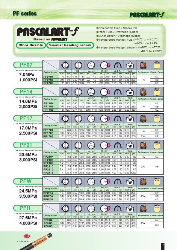 PF14 14.0 MPa / 2,000 PSI 1/4", 3/8", 1/2" 1W 0.10 – 0.23 kg/m 1.57 – 2.36 in