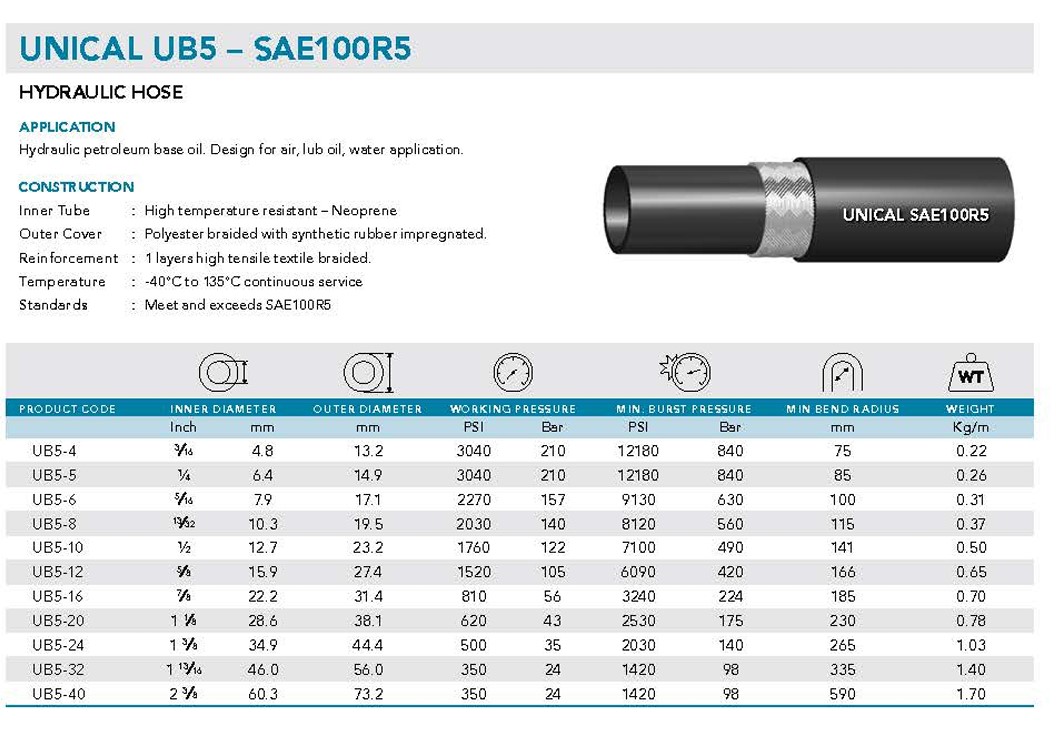 สายไฮดรอลิกแรงดันสูงรุ่น R5 จาก SUNFLEX ออกแบบสำหรับระบบน้ำมัน, ลม, เบนซิน และน้ำมันหล่อลื่น โครงสร้างเสริมลวดระหว่างชั้นผ้า 2 ชั้น แข็งแรง ยืดหยุ่น ทนอุณหภูมิได้ถึง 120°C เหมาะกับงานอุตสาหกรรมที่ต้องการความคงทนสูง