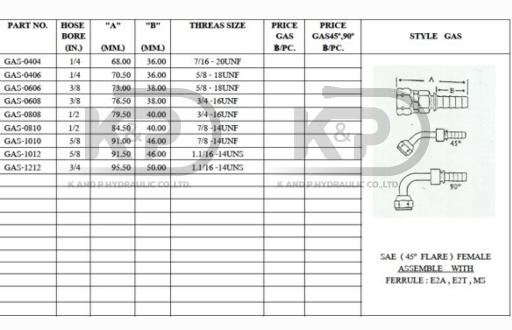 ชุดหัวสาย GAS ออกแบบมาเพื่อใช้งานกับระบบไฮดรอลิคแรงดันสูงตามมาตรฐาน SAE โดยมีลักษณะเป็นเกลียวตัวเมีย 45° Flare (UNF/UNS Thread)