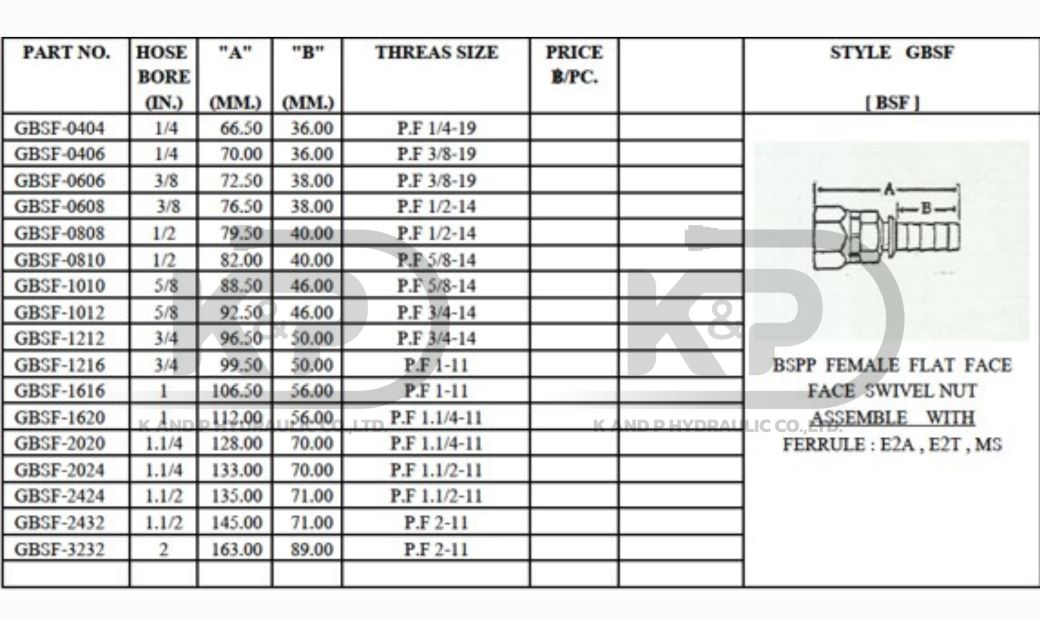 หัวสายเกลียวตรงแบบหน้าเรียบ (Flat Face) ชนิดเมียหมุนได้ (Swivel Nut) ออกแบบตามมาตรฐาน BSPP (British Standard Pipe Parallel) ใช้ร่วมกับปลอกอัด (Ferrule) รุ่น E2A, E2T หรือ MS เพื่อการเชื่อมต่อที่แน่นหนาและปลอดภัย